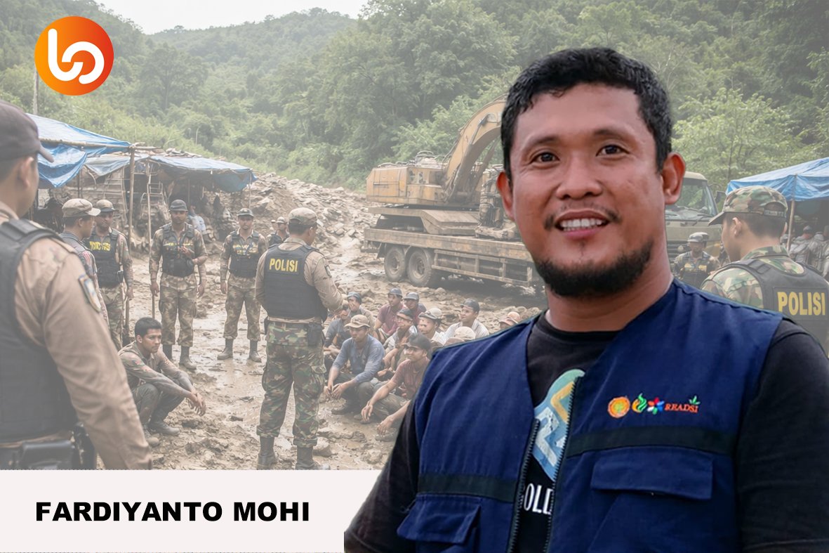 Foto: Fardianto Mohi, Ketua KNPI Kabupaten Pohuwato, digabungkan dengan foto latar ilustrasi penertiban wilayah pertambangan (AI)